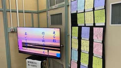 3年生による、修学旅行の思い出俳句を、スライドで発表しています。