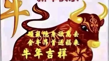 漢文には、「大きなネズミが身を隠し去っていき、金の牛が頭が高くあげて上げて福を送ってくる。」「牛年が良い年で有りますように。」という意味が込められています。