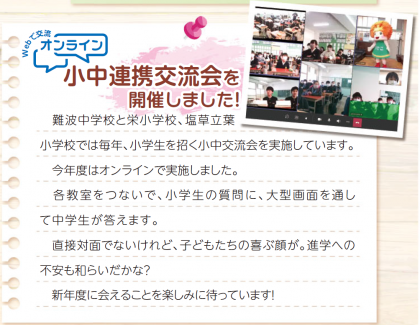 本校と校区の小学校である、塩草立葉小学校と栄小学校との「オンライン交流会」の様子が、浪速区の広報誌「広報なにわ」4月号に掲載されました!