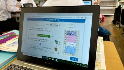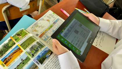 1年生の社会の授業です。QRコードを読み取り、資料にアクセスしています。