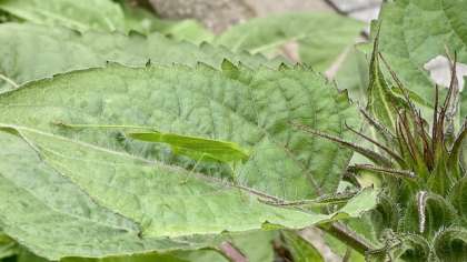 葉の色に紛れて分かりにくいですが、向日葵の葉の上でツユムシ科のバッタが。夏ですねぇ。
