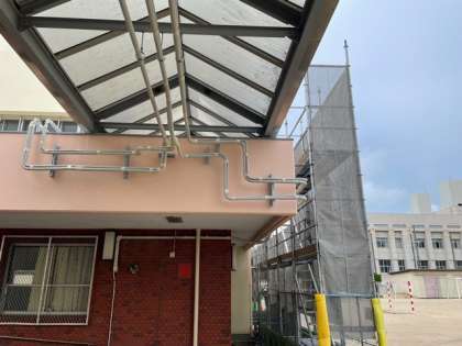 空調工事が進んでいます。写真は室外機からの配線設置の様子です。