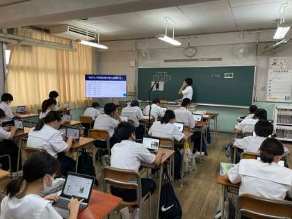 大阪市の理科の先生方が見守る中、タブレットを使っての授業が行われていました。たくさんの先生が見学されたので、少し緊張気味でしたが、皆さん頑張っていました。