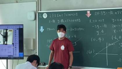 2年生の数学では!直線のグラフが通る2点を調べて、グラフをかくことにチャレンジしていました。