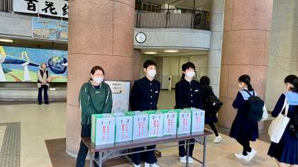 生徒会にて、登校時にエコキャップを回収しています。最終日までにどれだけ集まるでしょうか?