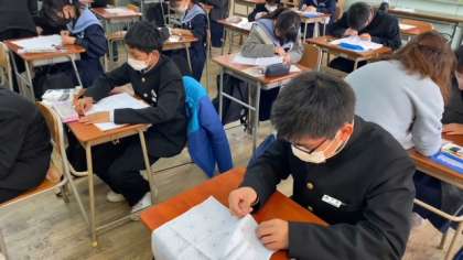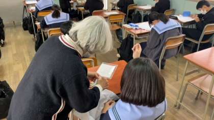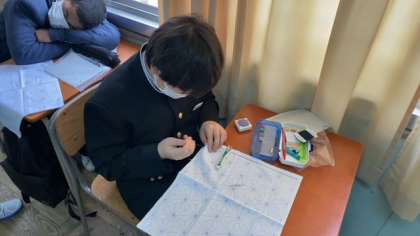 1年生の家庭科の時間。針を通すのがなかなかカタイ……。