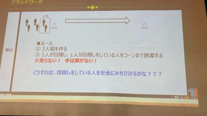 アイマスクをつけて声で誘導したり、パラリンピック競技であるゴールボールの体験を行いました。
