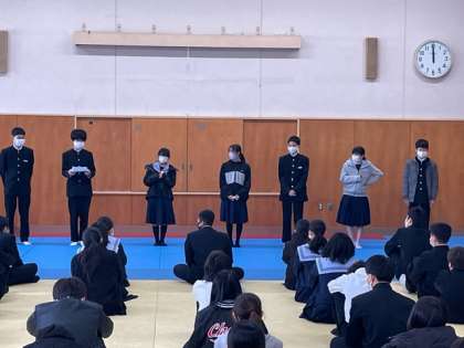 2年生は学級役員や生徒会役員の一言がありました。今年度の成果や反省点を話していました。