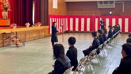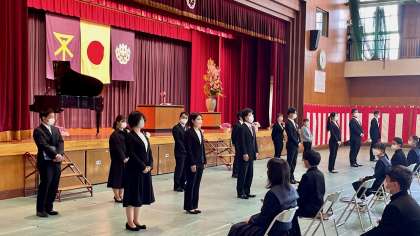 式後、担任や学年の先生、全体に関わる先生たちの紹介。ドキドキ!