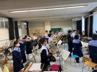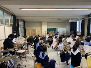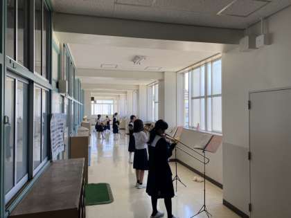 校舎内では吹奏楽部が活動。最初はいくつかのパート場所に分かれて練習、最後は皆で音を合わせていました。