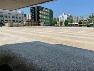 今日はグランドを使用しないため、にがり(土や砂が湿気を含み舞いにくくなる)をまきました。体育大会大会に向けての準備も修学旅行に並行して実施しています。