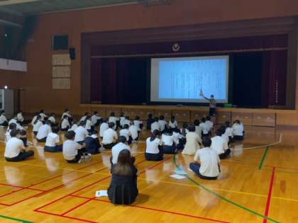 3年生が体育館にて 文化活動発表会に向けて、取り組みの流れや予定、台本の確認をしていました。