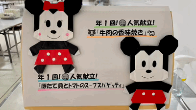 今日は給食は「牛肉の香味焼き」「ほたて貝とトマトのスープスパゲッティ」です。