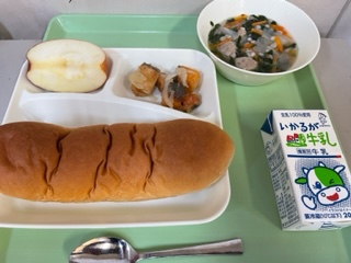 黒糖パン、牛乳、さけのマリネ、肉団子と麦のスープ、りんごでした。