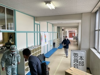 大地震を想定した避難所開設訓練が実施されています。学校は災害時、地域の避難所としても利用します。雨天にもかかわらず、地域の関係者や地域の方々がたくさん参加していました。