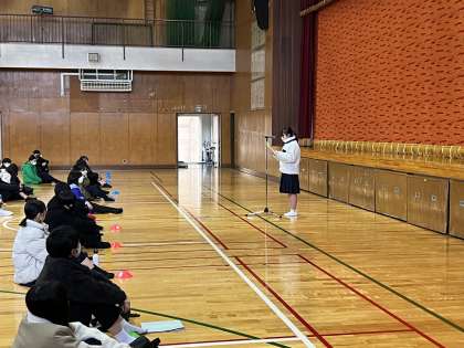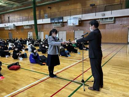 朝の全校集会にて「歯・口の健康に関する図画・ポスターコンクール」の表彰と、選挙管理委員会からのお知らせがありました。