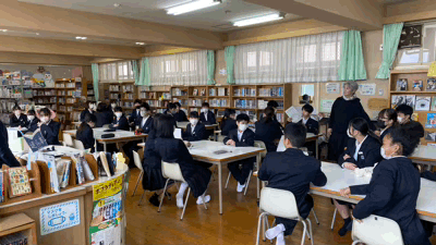 1年生の国語で図書室を利用しました。 主幹学校司書の大垣さんから説明を受けました。