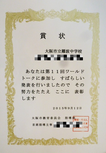 本校生徒が、第11回 ワールドトークで表彰されましたのでお知らせします!
