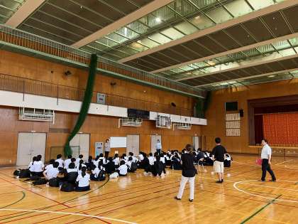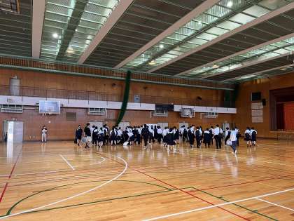 事前学習として、今日の6時間目に最終の確認と、班単位で素早く移動する練習を体育館で行いました。