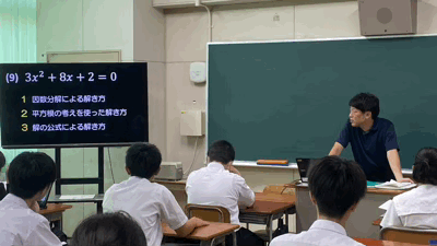 3年生の数学の授業では、二次方程式を解くにあたって、因数分解を使えばいいのか、平方根の性質を使えばいいのか、はたまた、解の公式を使えばいいのかについて、自分たちで考え、判断しています。