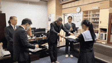 浪速区区長様、浪速税務署署長様、浪速納税協会会長様が本校まで来てくださり、「税の作文」の表彰をしてくださいました。
