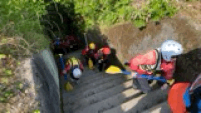 ラフティング体験を終えて、急な階段を登って帰ってきました。
