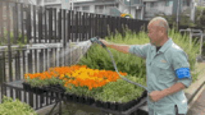 The management worker has been watering the flowers since morning. It's going to be hot again today, so please be careful of heatstroke.