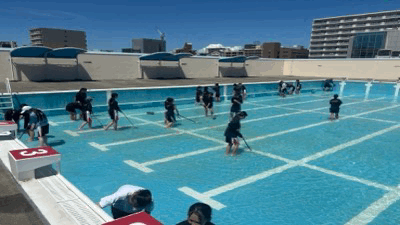 The women's basketball club and the badminton club cleaned the pool for the swimming class for the second semester! In the hot weather, everyone sweated and worked hard to clean up.
