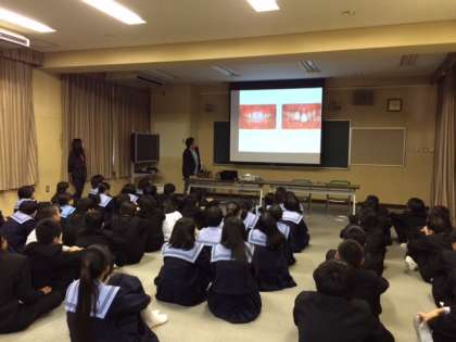 学校歯科医を招いて、本校1年生を対象に派と口の健康教室を行いました。
