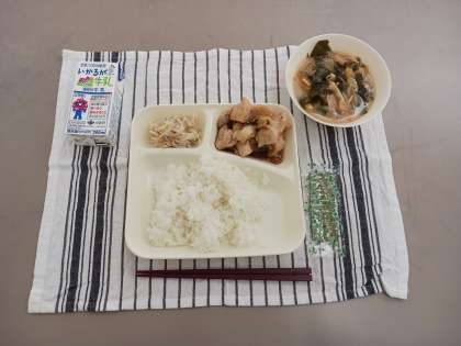 本日の給食は、米飯・牛乳・焼きとり・みそ汁・もやしのゆずの香あえ・焼きのりです。