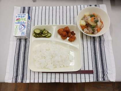 本日の給食は、米飯・牛乳・まぐろのオーロラ煮・豚肉と野菜の煮もの・きゅうりの甘酢づけです。