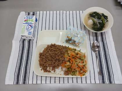 今日のメニューは、ビビンバです。ほかに牛乳・トック・いもけんぴフィッシュです。
