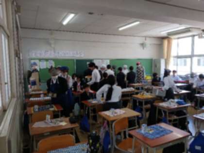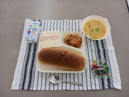 今日の献立は、黒糖パン・牛乳・煮こみハンバーグ・コーンスープ・豆こんぶ・スライスチーズです。