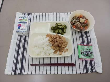 本日の給食メニューは、米飯・牛乳・肉じゃが・きゅうりの酢のもの・ごまかかいため・ソフト黒豆です。