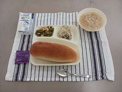 本日の献立は、コッペパン・牛乳・かつおのガーリックマリネ焼き・押麦のスープ・グリーンアスパラガスのソテー・ブルーベリージャムです。