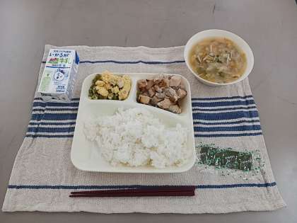 本日の献立は、米飯・牛乳・さけのみそ焼き・五目汁・焼きのり・えんどうの卵とじです。