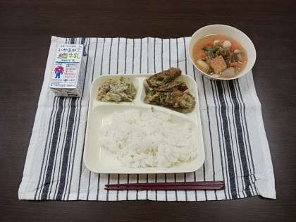 今日の献立は、米韓・牛乳・ちくわのいそべあげ・あつあげとさといものみそ煮・キャベツの赤じそあえです。