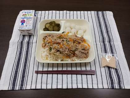 本日の献立は、米飯・牛乳・豚丼・きゅうりのかつお梅風味・白玉だんご・きな粉です。