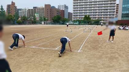 男子は、ハードル走を行っています。 テンポを乱さず走りきることが、ポイントになります。