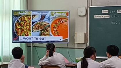 外国の料理を見ながら、I want to eat〜に続く言葉を答えます。