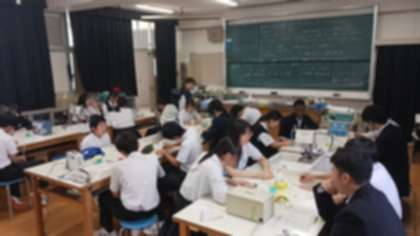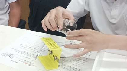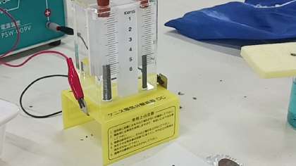 水溶液の電気分解を行って、水溶液に電気を通したときにできる物質を学んでいます。