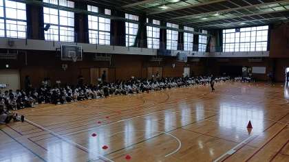 昨日からの降雨により、グランドの状態が悪いので体育大会予行を体育館で行います。