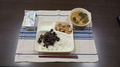 今日の献立は、米飯・牛乳・鶏肉の甘辛焼き・みそ汁・魚ひじきそぼろです。