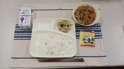今日の献立は、米飯・牛乳・マーボーはるさめ・チンゲンサイともやしの甘酢あえ・いり黒豆です。