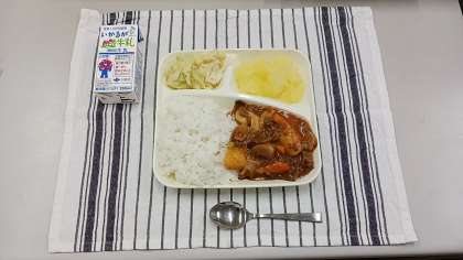 今日の献立は、ハヤシライス・牛乳・キャベツとコーンのサラダ・りんご(カット缶)です。