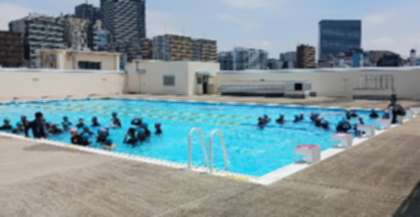 泳法を学ぶ前に、2人1組のバディシステムやボビングで呼吸の仕方を確認し、授業をすすめています。