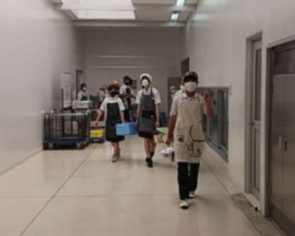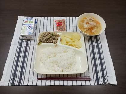 今日の献立は、米飯・牛乳・ゴーヤチャンプルー・五目汁・かつおぶし・焼じゃがです。