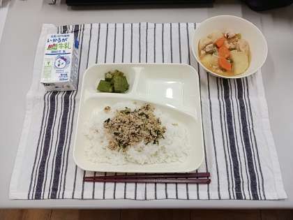 今日の献立は、米飯・牛乳・鶏肉と一口がんもの煮もの・オクラの梅風味・ツナっ葉いためです。