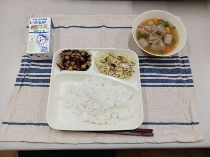 今日の献立は、米飯・牛乳・豚肉と野菜の煮もの・ひじき豆・ささみとキャベツのごまみそ焼きです。