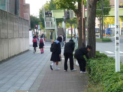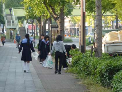『おはよう清掃』を行った後の道路には、ペットボトルや空き缶、コンビニ弁当の使用済み容器やレジ袋、タバコの吸い殻などのゴミはなく、とてもサッパリし、生徒も気持ちよく登校してきますが、私たち大人は、頑張ってゴミを集めている美化委員さんを褒めるのがいいのか、とても複雑な思いをしています。